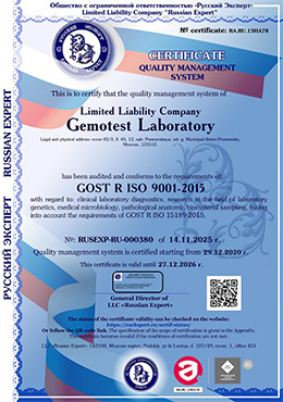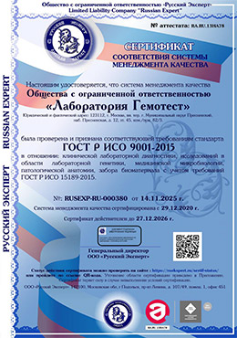 Система менеджмента качества ООО «Лаборатория Гемотест» сертифицирована и соответствует требованиям ГОСТ Р ИСО 9001–2015 с учетом требований ГОСТ Р ИСО 15189–2015.