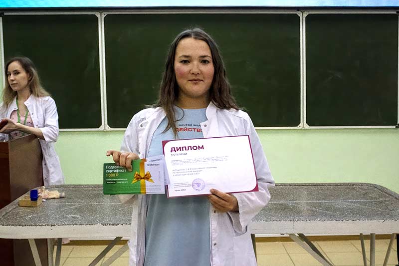 Ольга Симонова, руководитель дивизиона Гемотест в Омске и Томске, вручила победителям олимпиады сертификаты на лабораторные исследования, которые можно использовать в любом отделении сети, и подчеркнула: