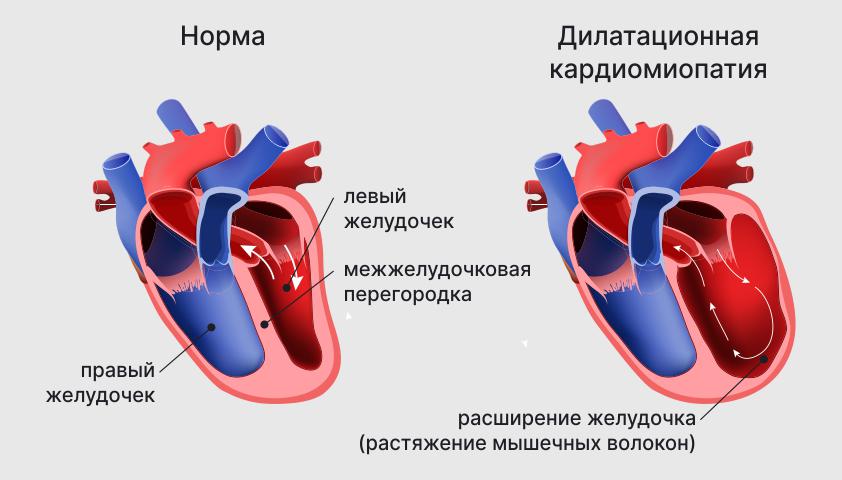 Дилатационная кардиомиопатия (ДКМП) связана с повреждением клеток миокарда — кардиомиоцитов. В результате мышечная ткань замещается соединительной, желудочки сердца увеличиваются, а их стенки истончаются.
