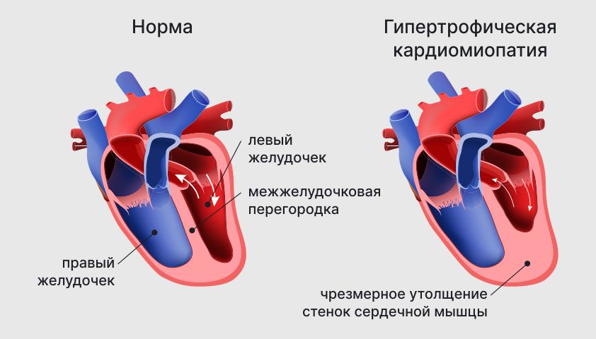 Гипертрофическая кардиомиопатия (ГКМП) обусловлена генетическими мутациями, нарушающими нормальный механизм сокращения сердечной мышцы. Характерная особенность заболевания заключается в том, что толщина миокарда левого желудочка становится более 1,5 см. Также болезнь может захватывать правый желудочек сердца.
