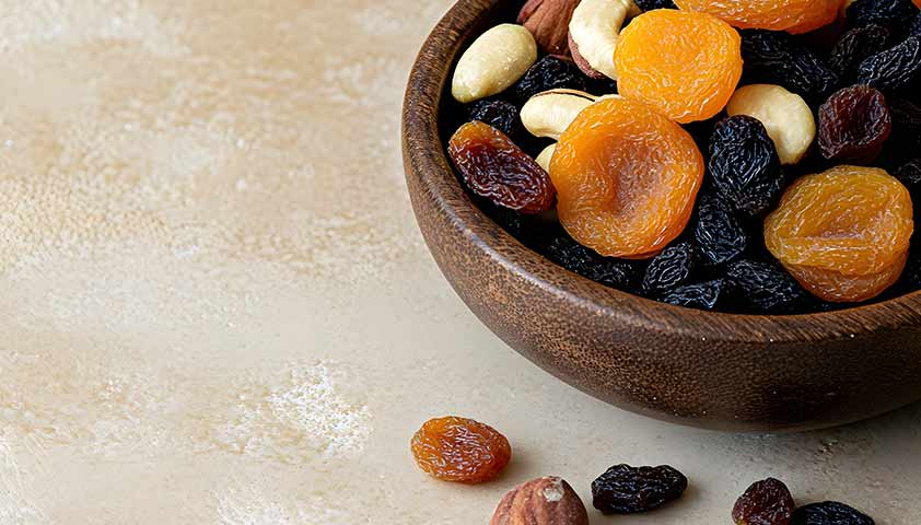 Курага и изюм содержат особенно много калия — до 1 700 мг на 100 г, но они очень калорийные