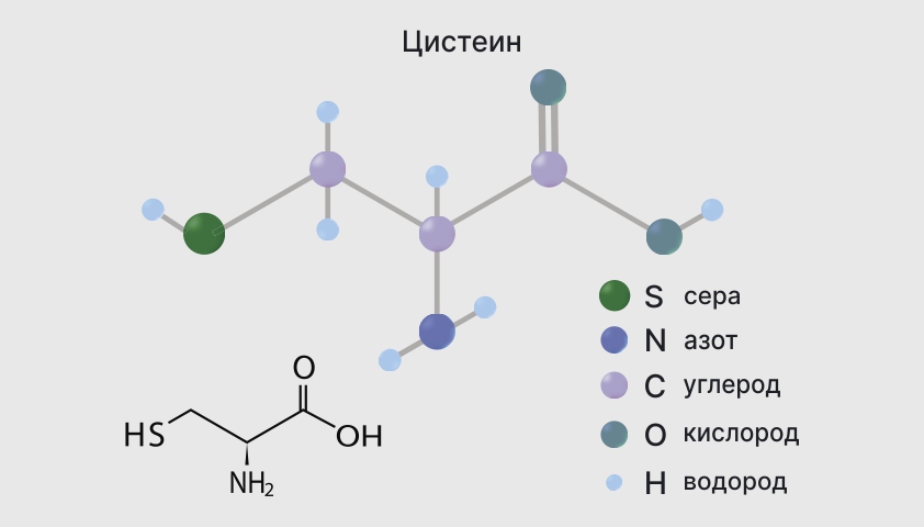 Цистеин принципиально отличается от других аминокислот тем, что в его состав входит тиоловая группа — соединение атомов серы и водорода (—HS). Благодаря этому молекулы цистеина образуют между собой очень прочные связи и стабилизируют структуру белков: без этого многие из них потеряли бы свою форму — в прямом смысле этого слова.