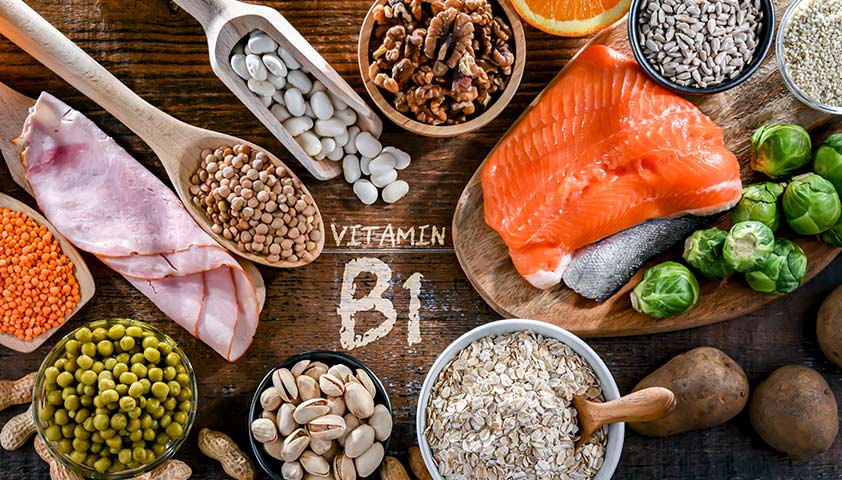 Его источники: пищевые дрожжи, семена подсолнечника, свинина, чечевица, орехи, бобовые, рыба, цельнозерновые продукты. При дефиците витамина появляется раздражительность, мышечная слабость, проблемы с сердцем, снижается аппетит.