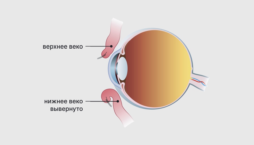 - эктропион — противоположное энтропиону нарушение, при котором веко вывернуто наружу;