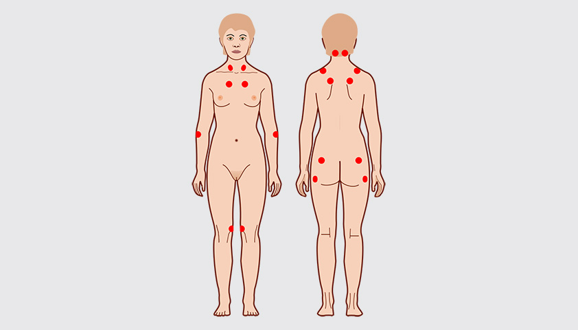 Расположение 18-ти болезненных точек при фибромиалгии