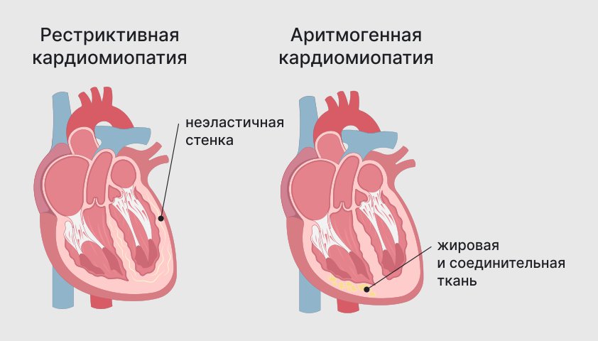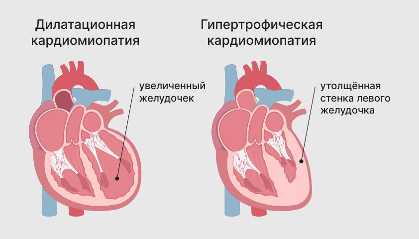 Кардиомиопатиями называют заболевания, которые поражают всю сердечную мышцу — миокард. Он может становиться жёстким, увеличиваться или уплотняться, а мышечная ткань — заменяться на рубцовую. В результате сердце не может эффективно прокачивать кровь и снабжать ею другие части тела.